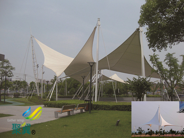 2. 景觀車棚更短的施工周期 膜工程中所有加工和制作依設計均可在工廠內完成,在現場只進行安裝作業。相比傳統建筑的施工周期,它幾乎要快一倍。