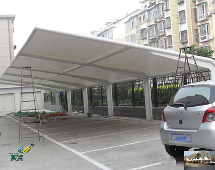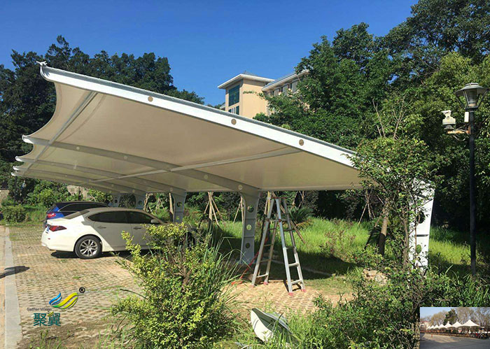 2、膜結構車棚我們應該知道張拉膜結構車棚安裝重要在于實現張拉膜和鋼結構支撐系統的協同工作.張拉膜是在支撐結構的拉力和自身重力的作用下繃緊,形成曲面。