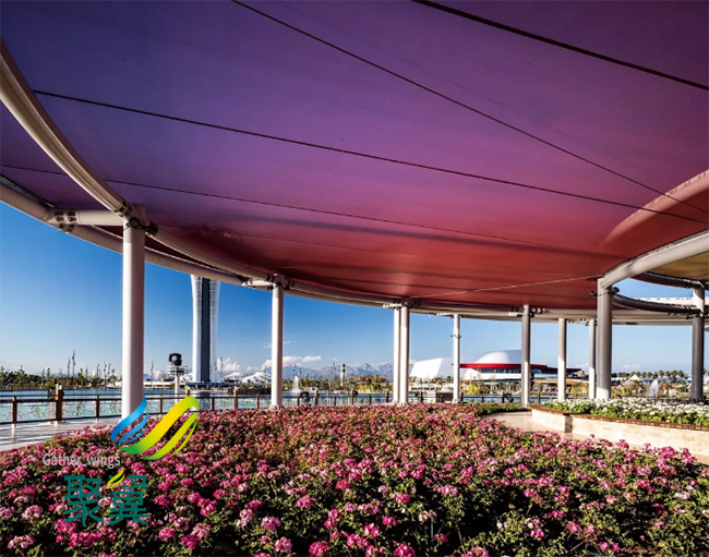 構(gòu)思:此處為芍藥花海觀賞臺,種植了五顏六色的芍藥花。花海頂部使用了Soltis frontview 381網(wǎng)孔膜做張拉膜屋面。381網(wǎng)孔膜開孔度為28%,在遮陽護花同時,有效為花海提供必要的光線和空氣循環(huán)。381織物為珠光色,在陽光下,芍藥花的色彩直接映射于膜面,形成了天然的幻彩。