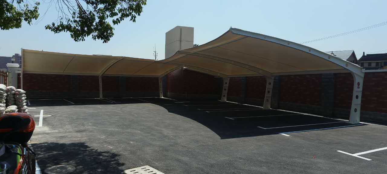 膜結構車棚中的膜材,因為其強大的張拉力才使其的外觀時尚,美觀,又因為膜材的張拉力強,所以在設計到安裝的每一個環節都必須有專業的人員完成。