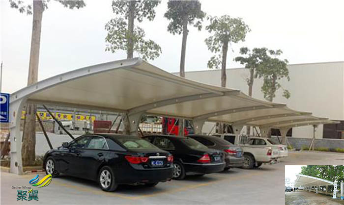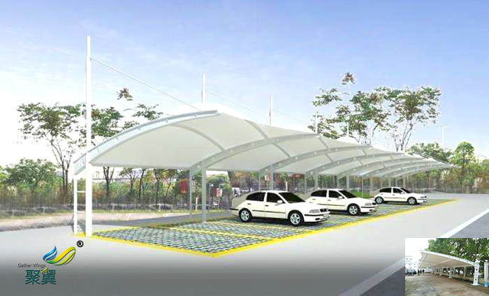 1、因為高強度的膜材出現(xiàn),再加上張拉膜的使用,使膜構(gòu)造車棚抵擋風(fēng)雨的才能是通常雨蓬之類不行比較的。