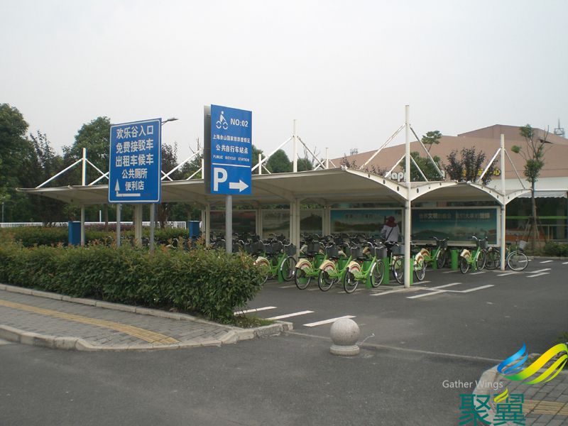 詳細>>徐州歡樂谷膜結構自行車停車棚,雙挑梁設計更大停放空間。膜結構自行車停車棚主骨架采用Q235鍍鋅...