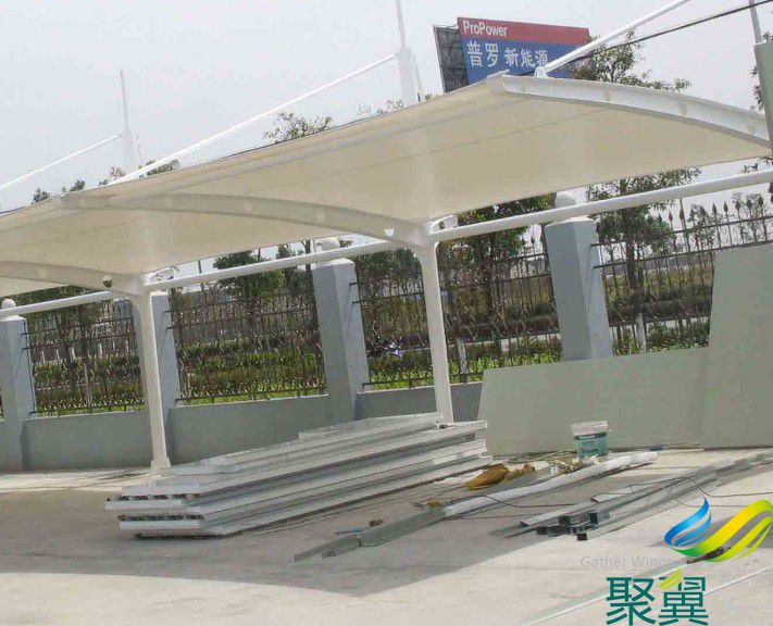 詳細>>JY-20雙開車棚資料選用膜構造建筑材料1 透光性:透光性好,透光率20% 在陽光下暴曬不會建立黃...