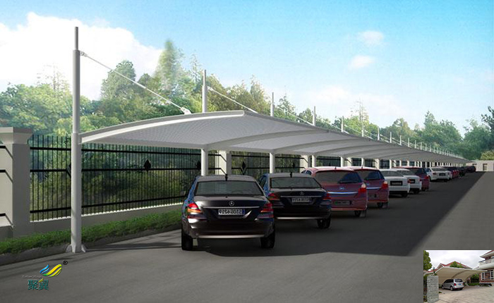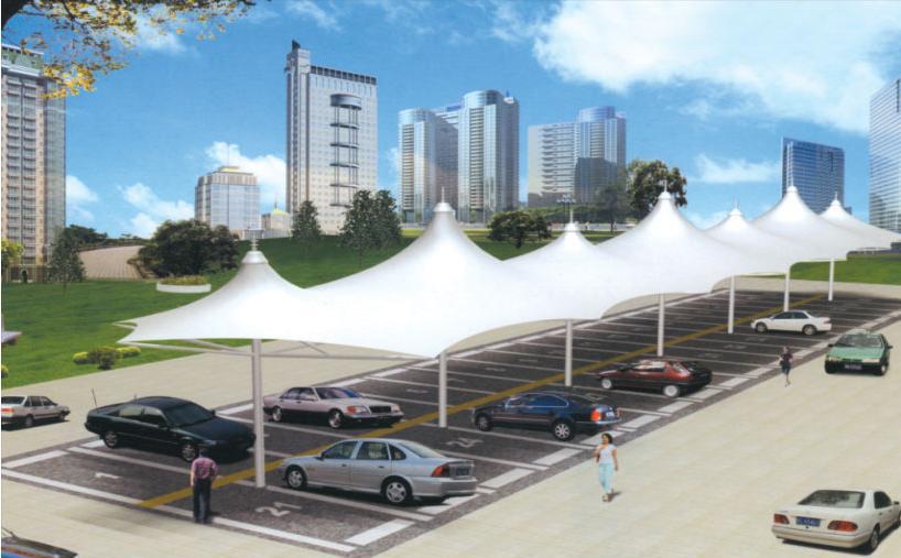 膜結構車棚耐候性:表面有防紫外線的共擠層,可防止太陽紫外線引起的樹脂疲勞變黃。表面共擠層具有化學吸收紫外線并轉化為可見光。對植物光合作用有良好的穩定效果(極適合保護各類車、貴重藝術品及展品,使其不受紫外線破壞)。