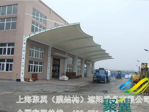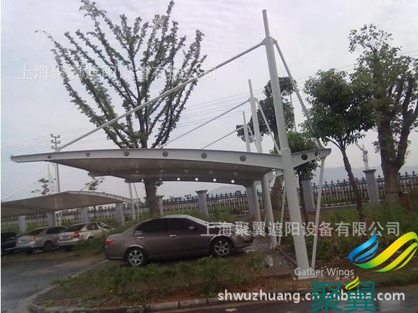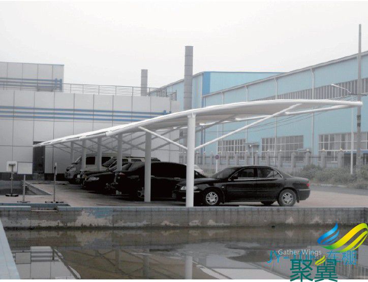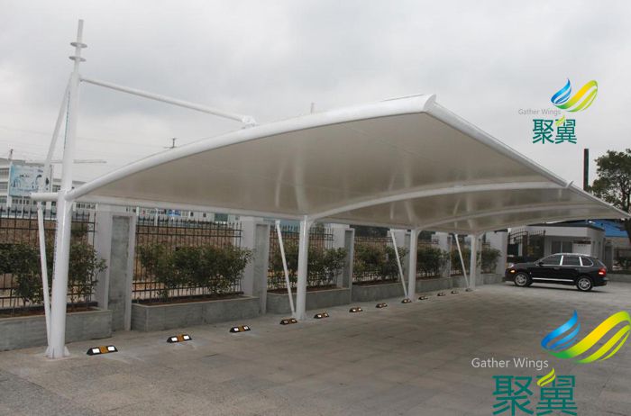 結構車蓬使用壽命及特點:膜結構車棚的篷布材質是膜材,而膜材的最大特點是強度高、耐久性好、防火難燃、自潔性好,不受紫外線影響,使用壽命長,一般15-30年。具有高透光率,透光率為13%,對熱能反射率73%,熱吸收量很少。