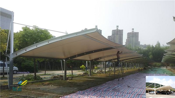 膜結構停車棚耐用:由于高強度的出現,再加上張拉技術的應用,使膜結構車棚抵御風雨的能力是一般雨蓬之類不可比擬的。有的車棚采用永久性膜材,可使用三、四十年。特別是遇到劇烈的暴風雨天氣,膜結構建筑巍然不動,毫發不損。