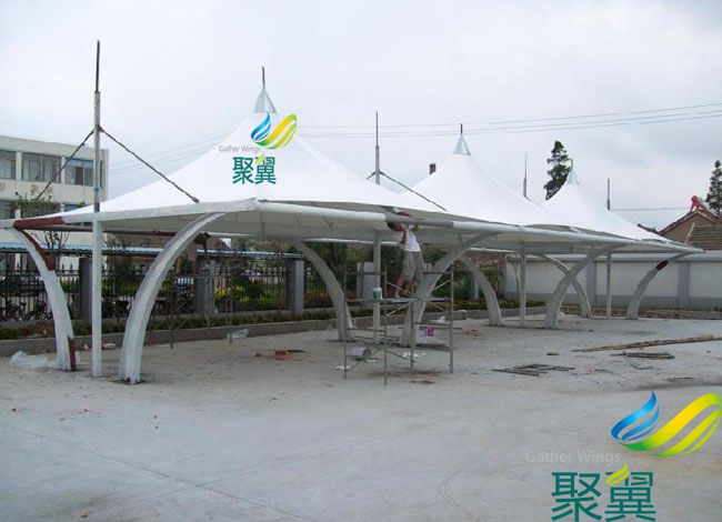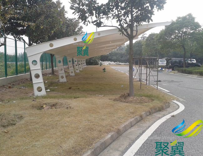 膜結構車棚作用:具有遮陽、擋雨、實用、美觀的作用。膜結構車棚可選材料:鋼材、鋼索、膜材料等。膜結構的結構形式:是由多種高強薄膜材料及加強構件(鋼架、鋼柱或鋼索)通過一定方式使其內部產生一定的預張應力以形成某種空間形狀,作為覆蓋結構,并能承受一定的外荷載作用的一種空間結構形式。