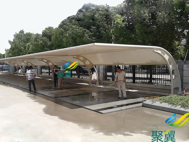 汽車遮陽棚鋼材選用:Q235熱鍍鋅高強度優質鋼材,拋丸防銹處理,表面噴漆,熱鍍鋅螺栓;鋼構工藝流程包含基層處理—涂防銹漆—刮膩子—涂磷化底漆等。汽車遮陽棚的尺寸,伸展長度為:6.5米,立柱間距為5米。