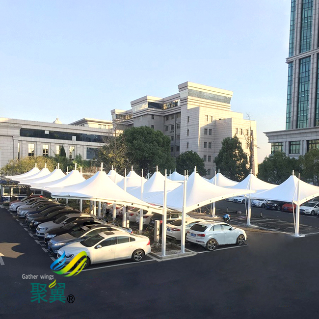 膜結構車棚藝術性:除了一般雨蓬不可比擬的實用、耐用、遮風擋雨的功能外,膜結構雨蓬更是一座雕塑,一件藝術品,給人美的視覺享受。其柔美,其曲線,其剛柔并濟,其豐富造型,其潔白無瑕,讓人眼前一亮,回味悠長。