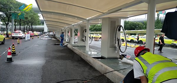上海虹橋機(jī)場(chǎng)出租車(chē)膜結(jié)構(gòu)充電樁車(chē)棚安裝現(xiàn)場(chǎng)
