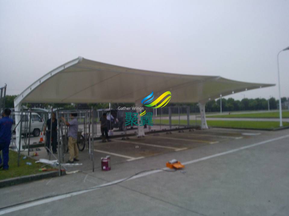 膜結構車棚不僅能遮陽,防雨,同時也能起到美化環境的功效,造型特殊(根據客戶的現場實際情況來定制,門頭過高以弧形的造型來協調)膜結構車棚可以使大都城市增添一道亮麗的風景線。青浦工業園膜結構車棚使用材料的是進口膜布PVDF,膜布材質較好,抗沖擊能力好,這樣能夠保護車棚內的車輛,不受雨水的沖刷。