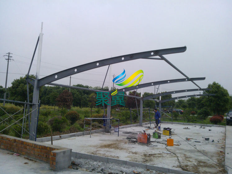 昆山張浦膜結構車棚訂制結合客戶要求訂制,長度18,寬6米,骨架采用鋼結構(國標Q235)鋼管一般厚度在: 7mm 材料制作而成,鋼結構要經過反復加工(切割、打磨、除銹、噴底漆、中間漆、面漆、成品后在做后期處理,從而達到持久不生銹效果),膜布采用PVDF膜材料1100g,拼接安裝一體化服務,承包車棚,款式多樣!