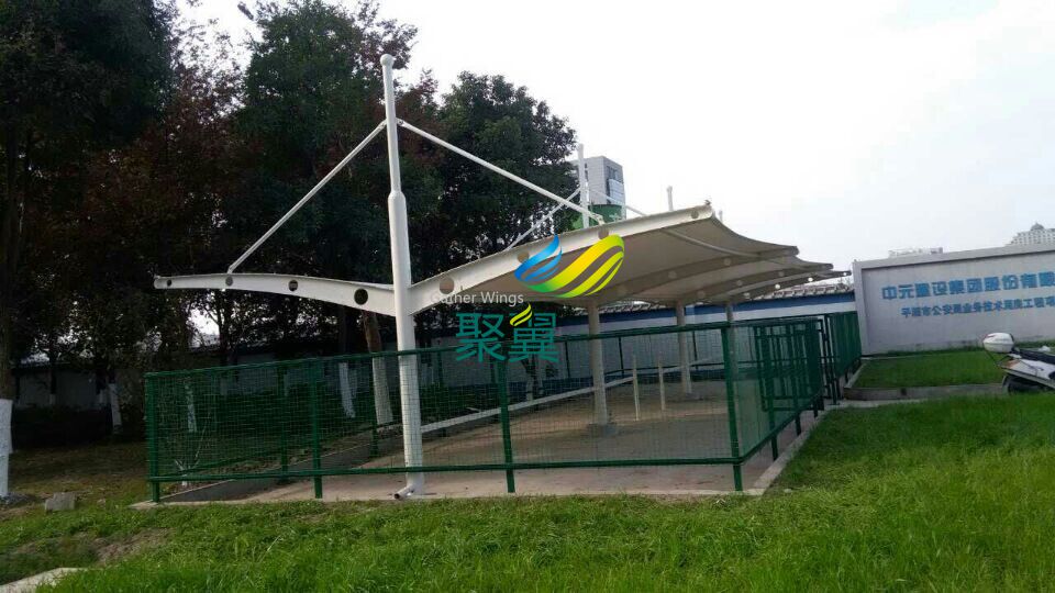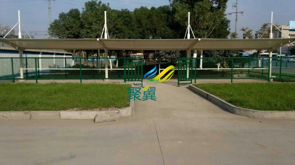 浙江平湖公安局雙開自行車棚立柱間距6米,伸出3米,立柱高4.5米,自行車棚骨架采用Q235鋼材料,膜布面料采用PVC960g膜材料。自行車棚款式多樣,根據現場尺寸量身定制。遮陽效果好,防水防火安全穩定性強!聚翼自行車棚加工廠全國配貨安裝,產品多樣化款式及材料方案。24小時客戶咨詢熱線:400-021-3310