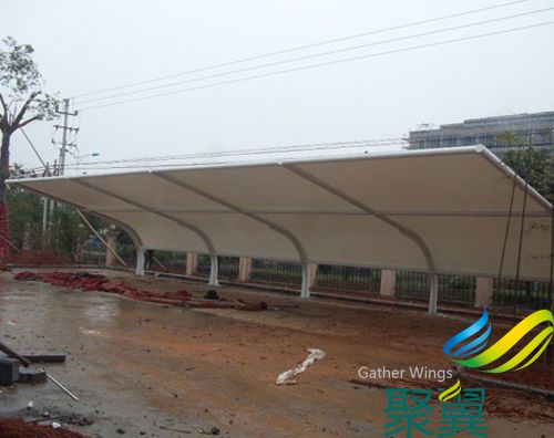 彎弧膜結構車棚整體設計考慮:遮陽防雨效果實用價值性,采用流線型設計大氣時尚。是一款具有現代時尚前沿結合的新式遮陽車棚,另外它具有自己獨特的防雨遮陽應用面積更大于普通車棚1.2倍的效果。價格方面考慮到鋼結構的整體用量與普通膜結構車棚相比,此款車棚鋼結構主體采用圓管鋼材大大減少了用鋼量,是一款經濟實用的高端車棚。 彎弧膜結構車棚整體壽命:正常使用情況下8-15年。 彎弧膜結構車棚面料選擇: PVC膜材規格:門幅2.7米、3.0米、3.2米。(每卷長度為100米) 膜材厚度:650g,950g,1100g,1200g,1300g每平方。 透光率為10%-15%,對熱能反射率73%。 其他進口膜材均可選擇:聚翼設計部為您量身訂制最佳方案!