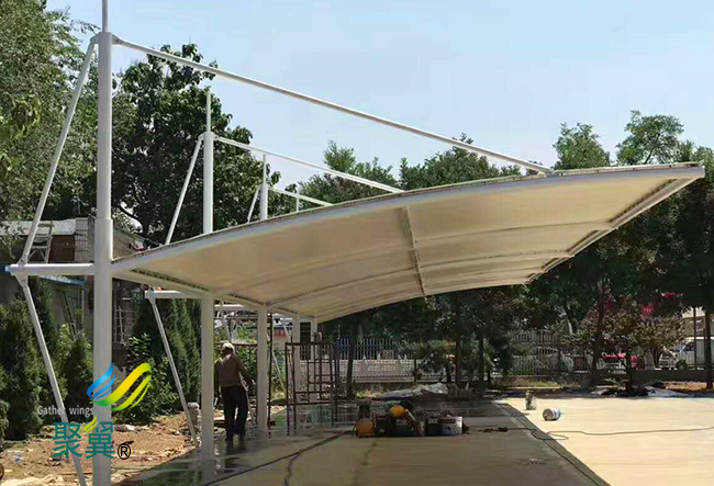 在選擇膜結構車棚材料的時候肯定要細致,材料直接影響車棚的使用結果和汽車棚的使用壽命。首先是保證膜結構車棚材料的耐用性,如許能夠更好地珍愛車棚里的車子的安全,分外是南方地區雨水比較多,而且經常有暴風雨,所以肯定要選擇抗風雨好的材料建設,以免碰到惡劣氣候受到損壞。