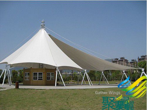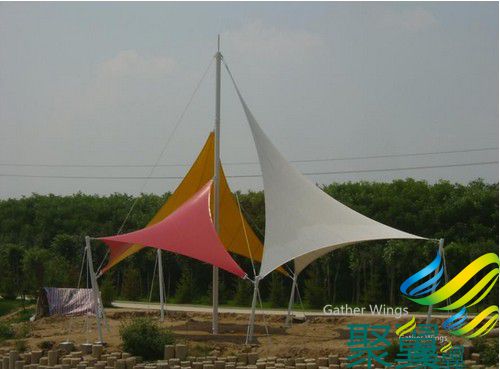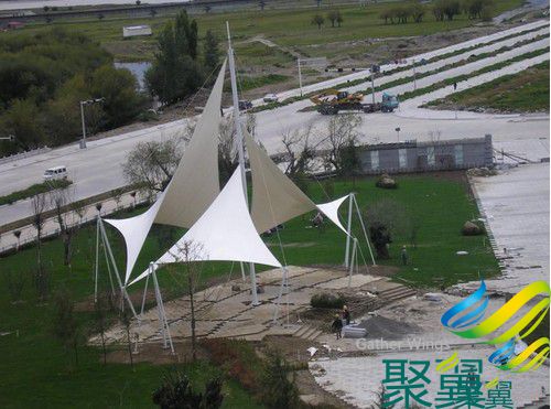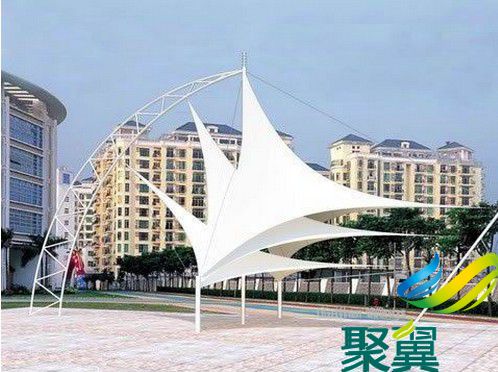 (1)透光、節能、環保、抗紫外線:景觀膜結構材具有優良的透光性,透光率為20%-95%,白天可以得到自然的漫射日光,節約大量照明能源,另外膜材具有反射光熱作用,可以節省部分作用于空調的能源。 (2)耐候性好,使用壽命長: 常用膜材以涂層聚脂織物纖維為主要材料,表面加上100%PVDP、涂層,物理性能可靠穩定,確保其使用壽命在20年以上。 (3)自重輕、抗震性能佳: 膜材料自重僅為鋼結構1/8,混凝土的1/40,可以建成大跨度的建筑。膜結構的預應力使其建筑膜材尺寸持久穩定,能夠抵抗狂風、大雪、地震等。 (4)防火、防潮、自潔: 膜材料表面經防護涂層處理后,不吸水、不受潮、抗磨損,防火阻燃,且落在膜材表面的灰塵可以靠雨水的自然沖洗達到自潔效果。 膜結構景觀的作用:具有遮陽、美觀、擋雨等作用。 膜結構景觀的材料:鋼索、膜材等工具。