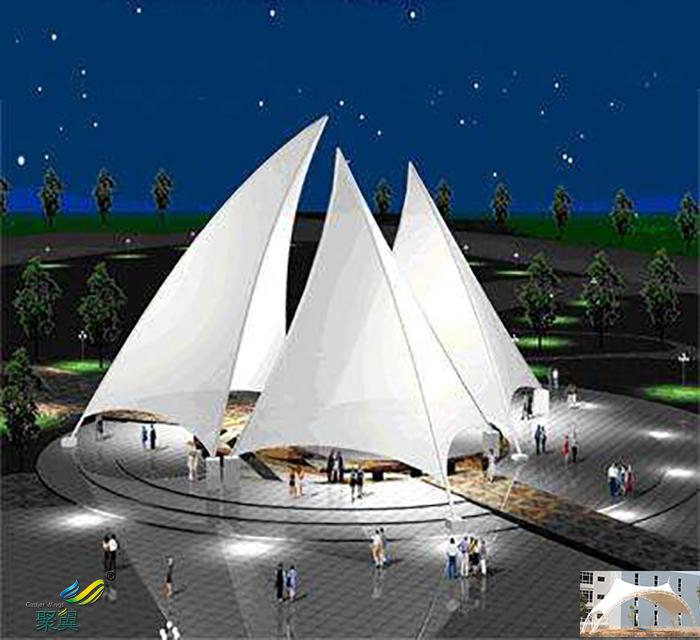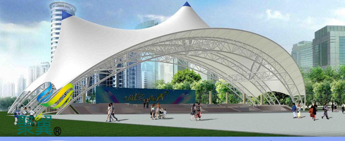 二、舞臺膜結構造型獨特:所用膜材是柔性材料、整體造型更容易實現獨特性,我們可以為客戶做多個造型方案由客戶選擇,定制化的流程可以保證舞臺自由空間曲面多變化。