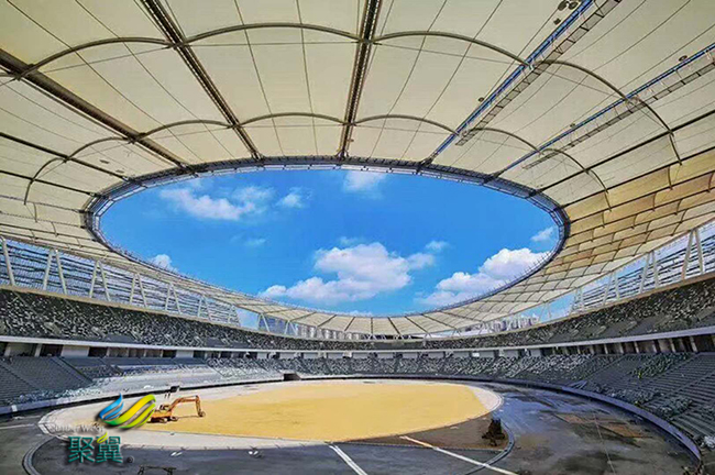 膜結構體育場外殼采用可作為填充物的氣墊膜,使屋頂達到完全防水的要求,陽光可以穿過透明的屋頂滿足室內草坪的生長需要.比賽時,看臺是可以通過多種方式進行變化的,可以滿足不同時期不同觀眾量的要求,且能保證每個人都能清楚的看到整個賽場.入口、出口及人群流動通過流線區域的合理劃分和設計得了完美得到的解決。