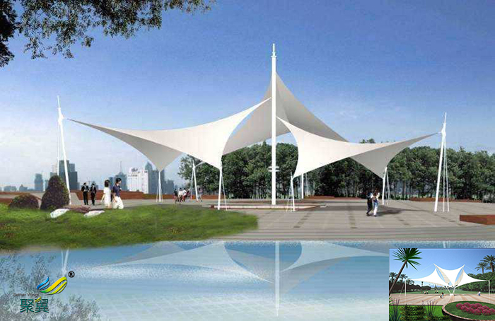 張拉膜結構是膜結構產品中的一個類別,它主要是利用高強度柔性薄膜材料與支撐體系相結合而形成的有剛度的穩定曲面,張拉膜結構造型自由、輕盈、柔美,充滿力量感;此外張拉膜結構大跨度和大空間的鮮明個性和標示性,讓它廣泛的應用到城市景觀小品設計中。現在各式各樣的景觀小品融入到我們的生活中,有植物小品、膜結構建筑小品,不同的構建藝術,可以帶給人們不同的視覺體驗。