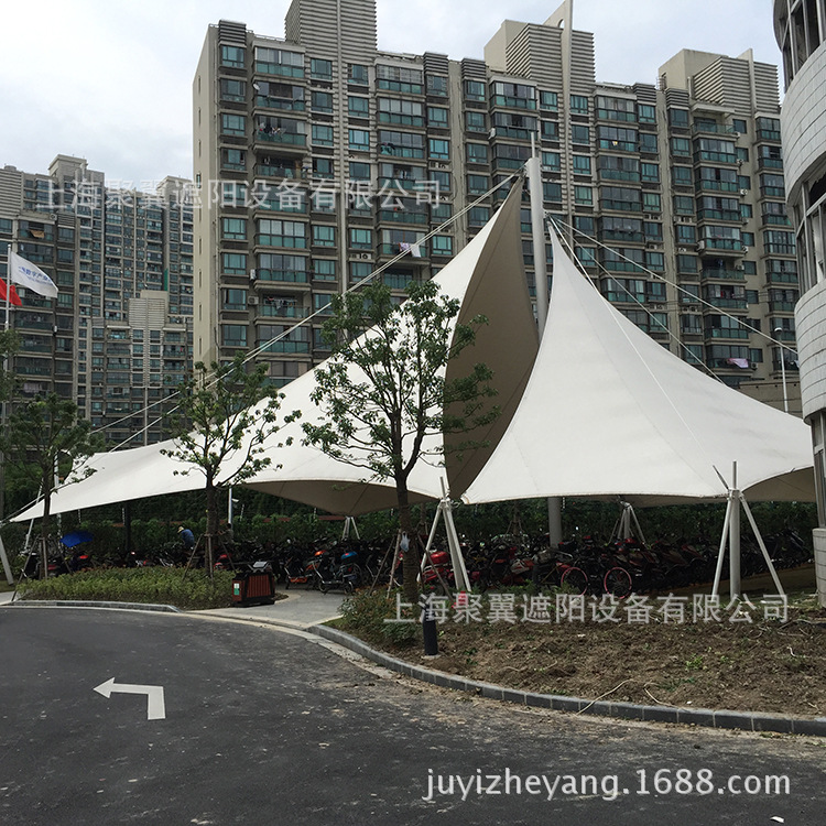 張拉膜景觀使用情況:遮陽防雨停放自行車棚,在混凝土建筑群里加入這種景觀張拉膜,鋼柔融洽美化了整個(gè)園區(qū)的風(fēng)景,與綠植并生戶外推薦的軟飾之一。
