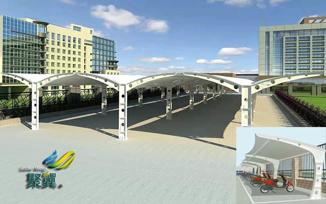 其次;我們可以通過更換韌性和光潔度更高的膜結構車棚膜布材料,來降低受到大風和大雨的阻力,變相的來增加膜結構車棚的張力,從而增加牢固度。