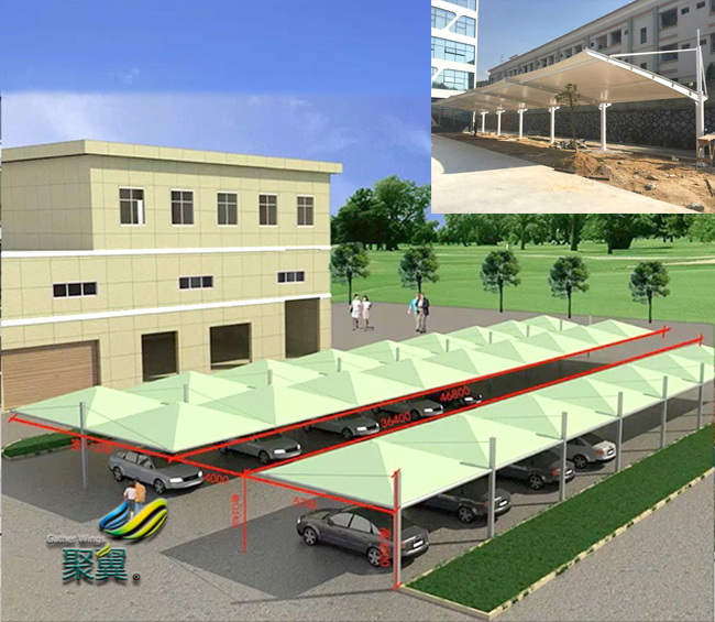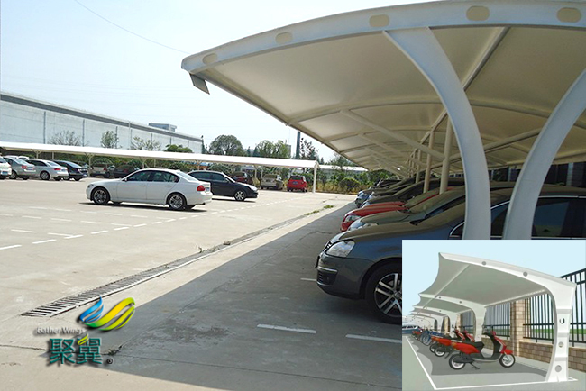 膜結構車棚耐用:由于高強度的膜材出現,再加上張拉技術的應用,使膜結構車棚抵御風雨的能力是一般雨蓬之類不可比擬的。有的車棚采用永久性膜材,可使用三、四十年。