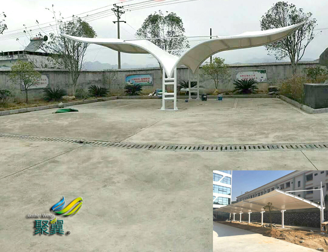 膜結構的車棚的制作的是應具備的專業的工藝的流程線、必要的是裁剪、熱合的設備的是及測試的設備。同時的是應具備的經鑒定或是專業的評定的膜結構的裁剪的設計的軟件。