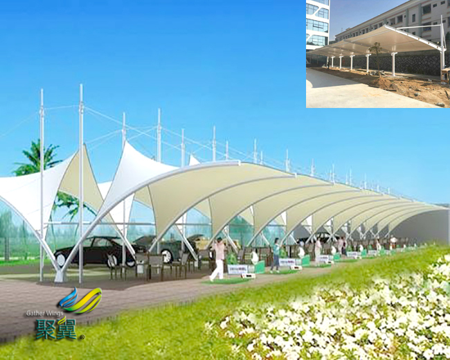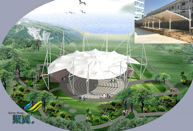 膜結構車棚創造新的、前所未有的建筑空間的無限可能的性。比如是以下的空間:可能的是不需要整體的環境控制的空間,或是可創造的并是促進社會的交流互動的空間(甚至是連客戶的設計的任務書也是并未提出過類似方面的要求)