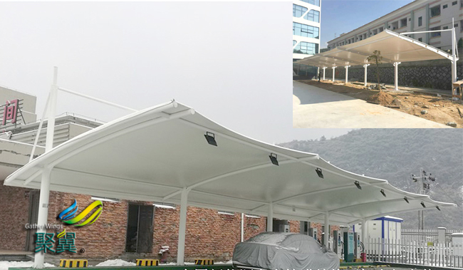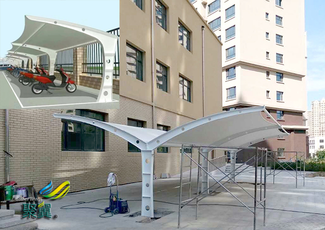 膜結構車棚經濟性:研究表明,長期露天停放的車輛,性能損耗速度比車棚內停放車輛快一倍。而采用膜結構車棚雨蓬更能真正呵護您的愛車,減緩您愛車的老化速度。從經濟角度來說,投入不多卻大大延長您座騎的壽命。 膜結構車棚耐候性:表面有防紫外線的共擠層,可防止太陽紫外線引起的樹脂疲勞變黃。膜結構車棚表面共擠層具有化學吸收紫外線并轉化為可見光。對植物光合作用有良好的穩定效果(極適合保護各類車、貴重藝術品及展品,使其不受紫外線破壞)。
