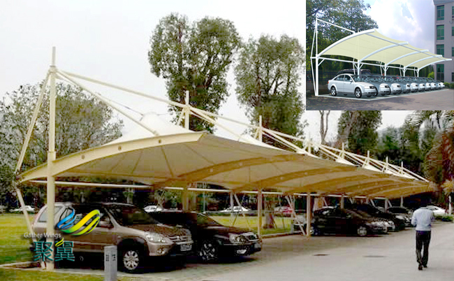 膜結構車棚是以鋼構或是集成材構成的棚頂骨架后,在其上方張拉膜材的構造形式,下部支撐結構安定性高,因膜結構車棚棚頂造型比較單純,開口部不易受限制,且膜結構車棚經濟效益高等特點,廣泛適用于任何大,小規模的空間。