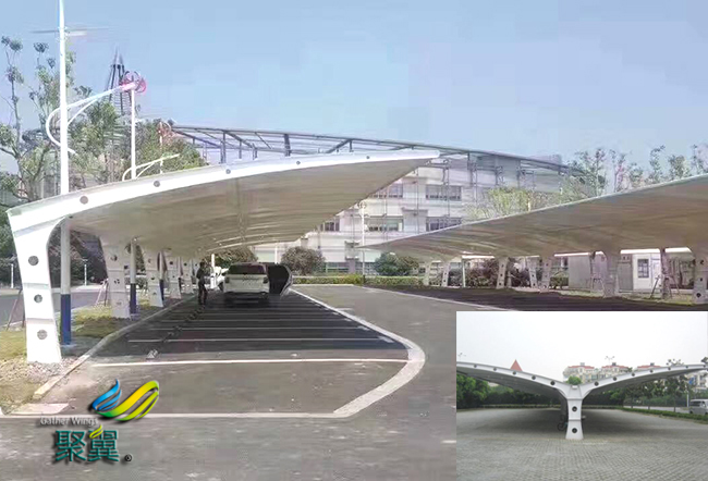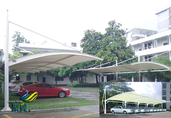 輕巧而美觀的膜結構車棚也適用于敞開或半敞開建筑物的遮蔽屋蓋尤為適宜。近年來在足球、田徑等比賽的體育場中,越來越多的看臺挑篷都采用膜結構。國外很多露天劇院的舞臺、博覽會的展覽館也都以膜結構車棚膜材作為頂蓋。在我國廣大地區的農貿市場也可大力推廣膜結構。