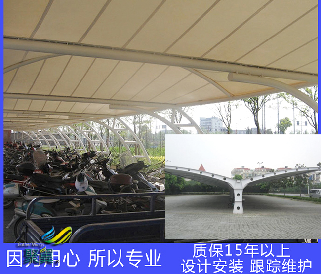 膜結構車棚高強度,重量輕,大跨度.這種構造方式所選用的資料是高強度織物資料,經緯交錯,膜結構車棚雙面PVDF涂層,耐久性10年以上;且重量輕,相當于一般鋼構造棚面的1/10;所以能滿足膜結構車棚大跨度的請求.