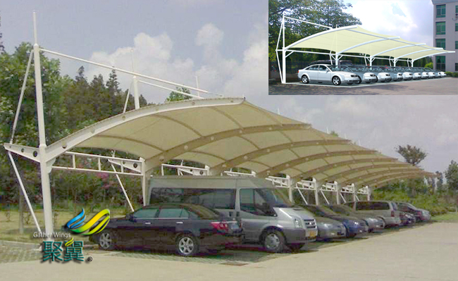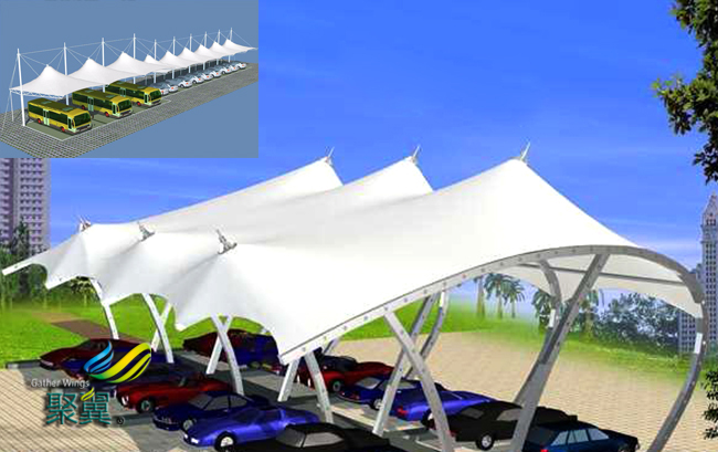 膜結構車棚經濟性.對于一般的大跨鋼屋面構造其本錢在1/2左右;如今,在健康主導的和諧社會里,張拉膜膜結構車棚構造方式將成為干流,為你我搭建一片遮陰避雨的場合,為你我增加一道漂亮的風景線.