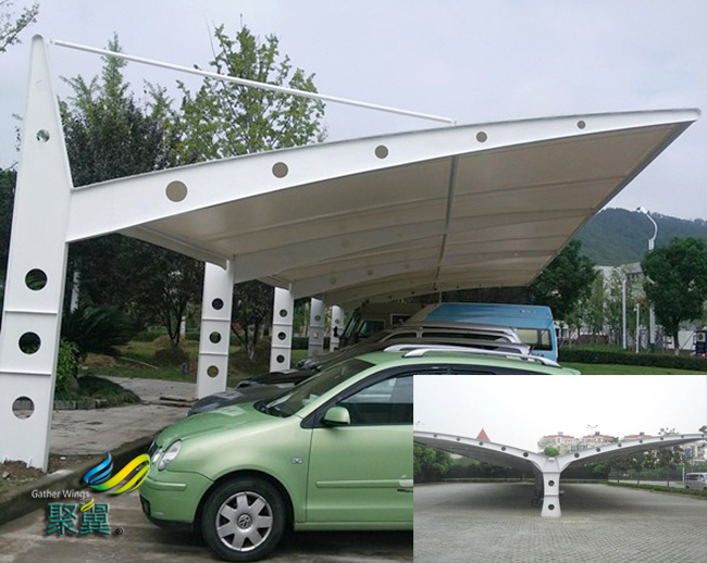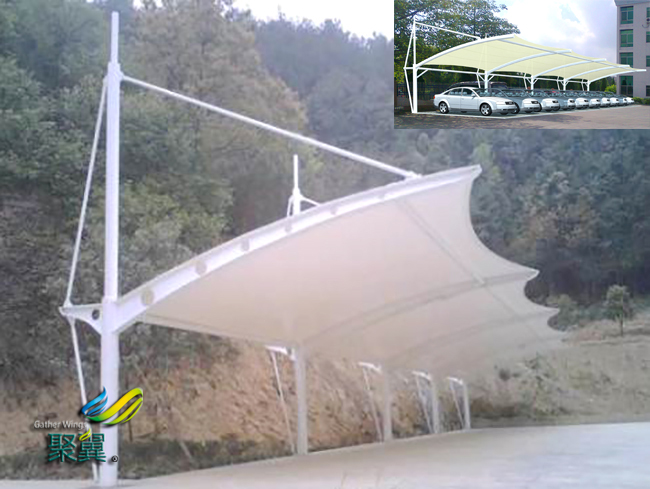 膜結(jié)構(gòu)車棚膜材料不僅具有優(yōu)良的抗沖擊性能、電性能、熱穩(wěn)定性和耐化學(xué)腐蝕性,而且膜結(jié)構(gòu)車棚機(jī)械強(qiáng)度高,加工性能好。玻纖PVC建筑膜材這種膜結(jié)構(gòu)車棚膜材開發(fā)和應(yīng)用比較早,通常規(guī)定PVC涂層在玻璃纖維織物經(jīng)緯線交點(diǎn)上的厚度不能少于0.2mm,一般涂層不會(huì)太厚,達(dá)到使用要求即可。