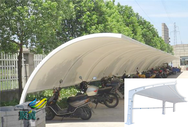 相對于膜結構車棚來說,整體能承受的載荷會小很多,遇到劇烈的暴風雨天氣,膜結構車棚頂棚會和支撐件分離。而膜結構車棚受力點小,單位尺寸上能承受的壓強高,因此在多次的實踐中,膜結構車棚都穩固如山。
