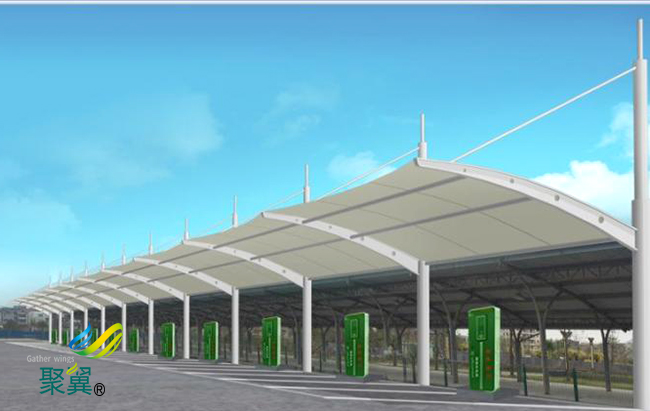 膜結構車棚能夠遮風擋雨的特性,是其他的材料所無法比擬的,很多大的設備廠家或者是企業之所以選擇這種膜結構車棚材料是因為材料的優越性。