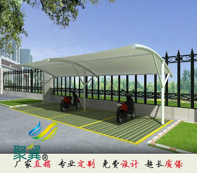 自重輕,膜結構車棚膜建筑可以不需要內部支撐面大跨度覆蓋空間,這使人們可以列靈活、更有創意地設計和使用建筑空間。膜結構車棚具有傳統屋頂所不具備的藝術感造型。
