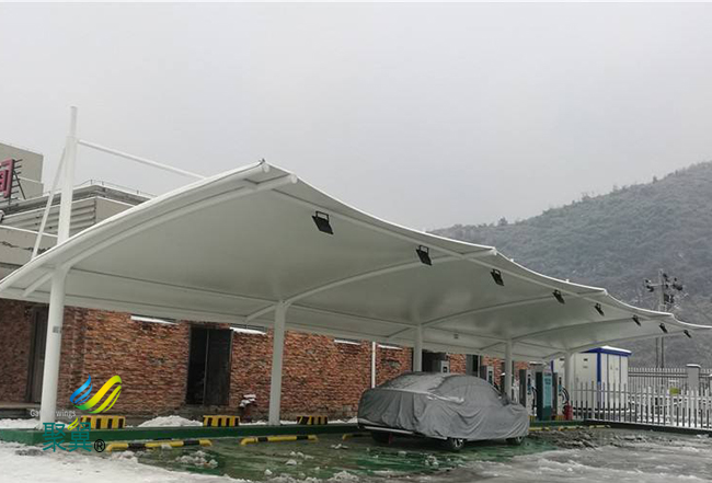 膜結構車棚具有極好的透光效果,膜結構車棚透光率可達30%,而其他類型的產品一般來說透光率可以說是極差的存在,致使車棚會因為長期暴曬二變黃損害,而膜結構車棚透光率就確保了不會出現這樣的問題,從側面可以看出膜構造的車棚使用的壽命要更加的長久。