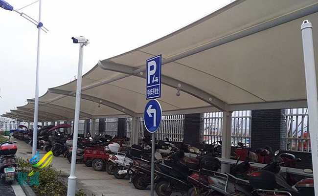 膜結構車棚藝術性。膜結構突破了傳統的建筑結構類型,以造型學、色彩學為依托,可結合自然條件, 膜結構車棚充分發揮建筑師的想象力,根據創意建造出傳統建筑難以實現的曲線及各種造型,且色彩豐富,富有時代氣息, 膜結構車棚體現結構構件受力之美。配合燈光易形成夜景,給人以現代美的享受。