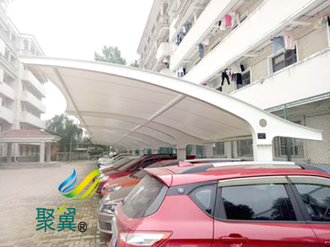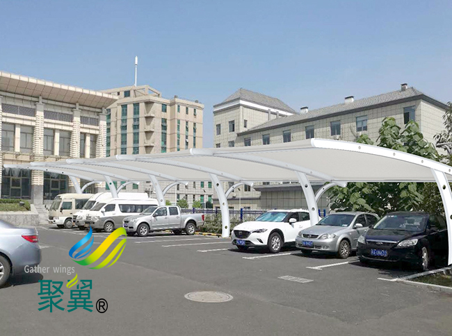 藝術性。膜結構車棚是一種新型的建筑結構形式,它不同于中國傳統建筑。由于膜結構車棚占地面積小、可便于安裝拆卸等特點,設計師可以充分發揮自己的想象力,設計出造型多樣、不拘一格的膜結構車棚。