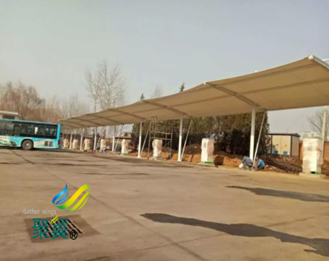 膜結構車棚藝術性:除了一般雨蓬不可比擬的實用、耐用、遮風擋雨的功能外,膜結構車棚雨蓬更是一座雕塑,一件藝術品,給人美的視覺享受。
