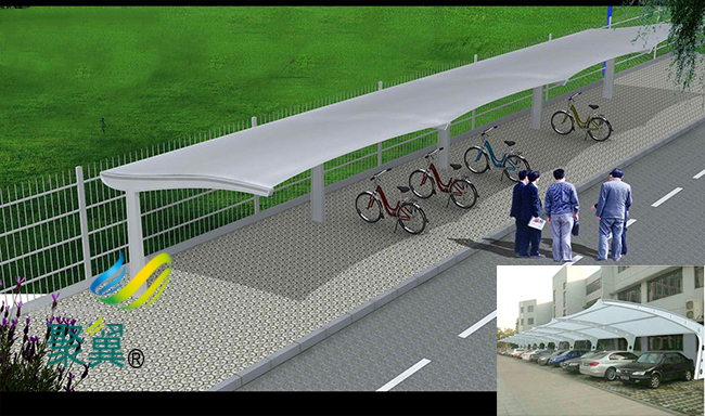膜結構車棚膜材料具有高強度的特點,再加上張拉技術的應用,根據力學原因構造外圍,使得膜結構車棚自行車車棚的支撐力和強度遠遠高于其他材料。