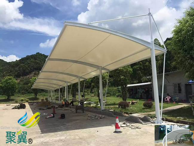 膜結構車棚上下打膠:充分清潔玻璃間縫隙,大連市普蘭店市膜結構車棚不應有水、油漬、涂料、鐵銹、水泥砂漿、灰塵等。充分清潔粘結面,加以干燥。為調整縫的深度,避免三邊粘膠。在縫兩側貼保護膠紙保護玻璃不被污染。上下同時打密封膠,注膠后將膠縫表面抹平,去掉多余的膠。注膠完畢,將保護紙撕掉,必要時用溶劑擦拭玻璃。大連市普蘭店市膜結構車棚膠在未完全硬化前,不要沾染灰塵和劃傷。