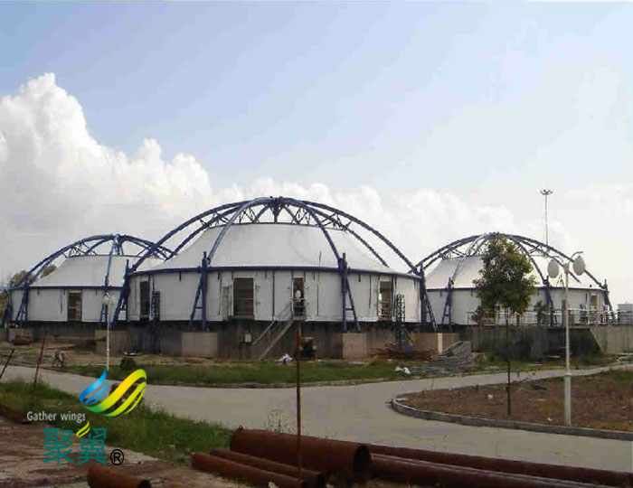 污水池蓋也叫污水池罩、臭氣收集罩。是一種新型的大跨度空間結(jié)構(gòu),越來(lái)越受到用戶(hù)的喜愛(ài)和使用,污水池加蓋是由具有優(yōu)良性能的織物(膜材)通過(guò)支撐構(gòu)件(如剛性梁、柱、柔性索),或給膜內(nèi)空氣加壓以一定的方式組合并施加適當(dāng)?shù)某跏碱A(yù)張力而形成具有一定剛度的空間結(jié)構(gòu)形狀,從而承受一定外荷載的一種空間結(jié)構(gòu)形式。而膜材料是大跨度空間結(jié)構(gòu)最重要的組成部分,被稱(chēng)為“第五代建材”。具有耐腐阻燃,堅(jiān)固防滑、質(zhì)量輕、易安裝、免維護(hù)、絕緣等優(yōu)異特性。