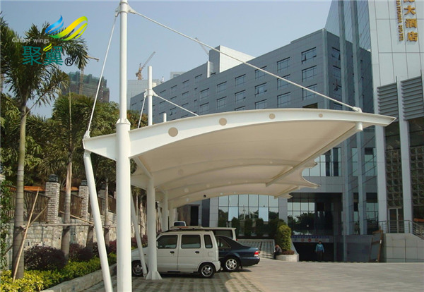 膜結(jié)構(gòu)工程停車棚的棚布材料是膜結(jié)構(gòu)工程,而膜材的較大 特性是抗壓強度高、使用性能好、防火安全阻燃、自洗性好,不會受到紫外光危害,使用期長,一般15-30年。膜結(jié)構(gòu)工程停車棚具備高透光度,透光度為13%,對能源透射率73%,熱吸發(fā)熱量非常少。膜結(jié)構(gòu)工程中的高韌性柔韌性塑料薄膜稱膜材,它是一種耐久度用、高韌性的鍍層紡織物,由紡織物和鍍層復合型而成,具備材質(zhì)柔韌性、薄厚小、重量較輕、透光度好的特性。對太陽光消化吸收和散射工作能力、阻燃性,具備優(yōu)良的耐久度、防火安全、氣密性等特點;表層歷經(jīng)氟素處理或二氧化鈦解決的膜原材料耐老化特性好,具備較高的自清理特性。膜結(jié)構(gòu)工程建筑美學幽美,膜結(jié)構(gòu)建筑是二十一世紀膜結(jié)構(gòu)具象征性與填滿發(fā)展前途的建筑形式。