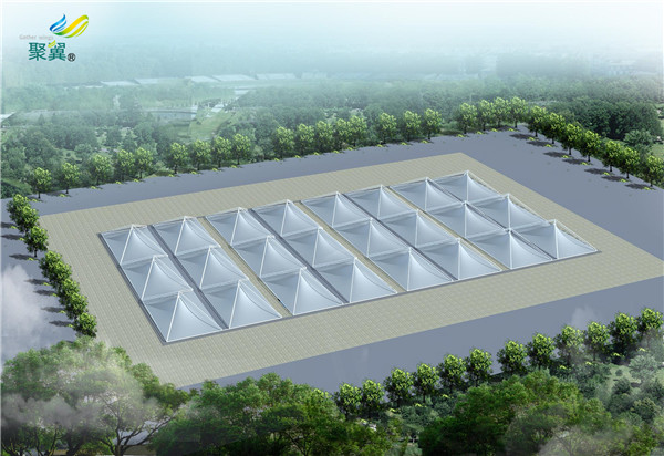 反吊膜結構外觀優美,除臭顯著,安裝維修方便,常被用來治理污水池廢氣收集問題,面對越開越緊張的環境形勢,對污水池進行廢氣收集是提高環境質量的有效措施。在進行反吊膜結構施工安裝的時候,對于通過集中施力點施加預張力的膜結構,在施加預張力前應將支座連接板和所有可調部件調節到位。