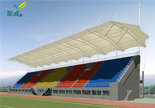 2、膜結構看臺采用的膜結構材料價格低,張拉膜結構造價也是根據不同的跨度和設計方案差異比較大的,但是和傳統建造相比,性價比較高,由于回膜結構體育看臺材料透光率好,使其可以保證場地內的空間的明亮度。建造施工工期短,膜結構加工制造都是在工廠內完成的,縮短了施答工時間,從而也為企業節省了施工成本。跨度大,而且膜材料比較輕,因而能夠創造更加開闊的無遮擋可視空間。