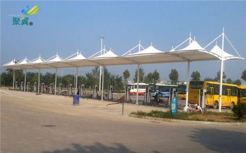 膜結構停車棚,自重輕,具有良好的受力特點——成為大跨度空間結構的主要形式之一。停車場的規劃和建設成為現代城市規劃的重要組成部分,在以后的建設里會變得越來越重要。膜結構輕巧、別致的造型在停車場及候車廳的建設中擔當了重要角色,除了滿足防風雨、防日曬等基本功能外,并有較好的標識招攬效果,展現了人們個性化的一面。