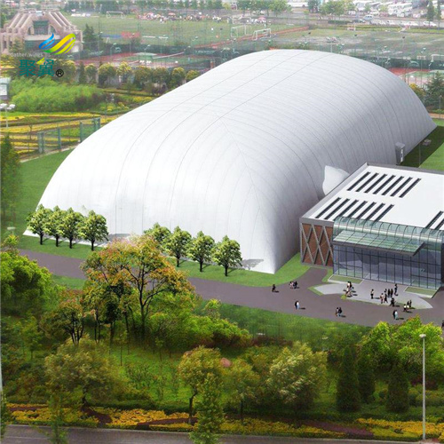 充氣式膜結構是將膜材固定于屋頂結構周邊,利用送風系統讓室內氣壓上升到一定壓力后,使屋頂內外產生壓力差,以抵抗外力,因利用氣壓來支 撐,及鋼索作為輔助材,無需任何梁,柱支撐,可得更大的空間,施工快捷,經濟效益高,但需維持進行24小時送風機運轉,在持續運行及機器維護費用的成本上較高。