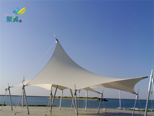 張拉結(jié)構(gòu)的靈活性使其可以產(chǎn)生很大的位移而不發(fā)生永久性變形。膜材的彈性性能和預(yù)應(yīng)力水平?jīng)Q定了膜結(jié)構(gòu)的變形和反應(yīng)。適應(yīng)自然的柔性特點可以激發(fā)人們的建筑設(shè)計靈感。不同的膜材的柔性程序也不相同,有的膜材柔韌性極佳,不會因折疊而產(chǎn)生脆裂或是破損,這樣的材料是有效實現(xiàn)可移動、可展開結(jié)構(gòu)的基礎(chǔ)和前提。